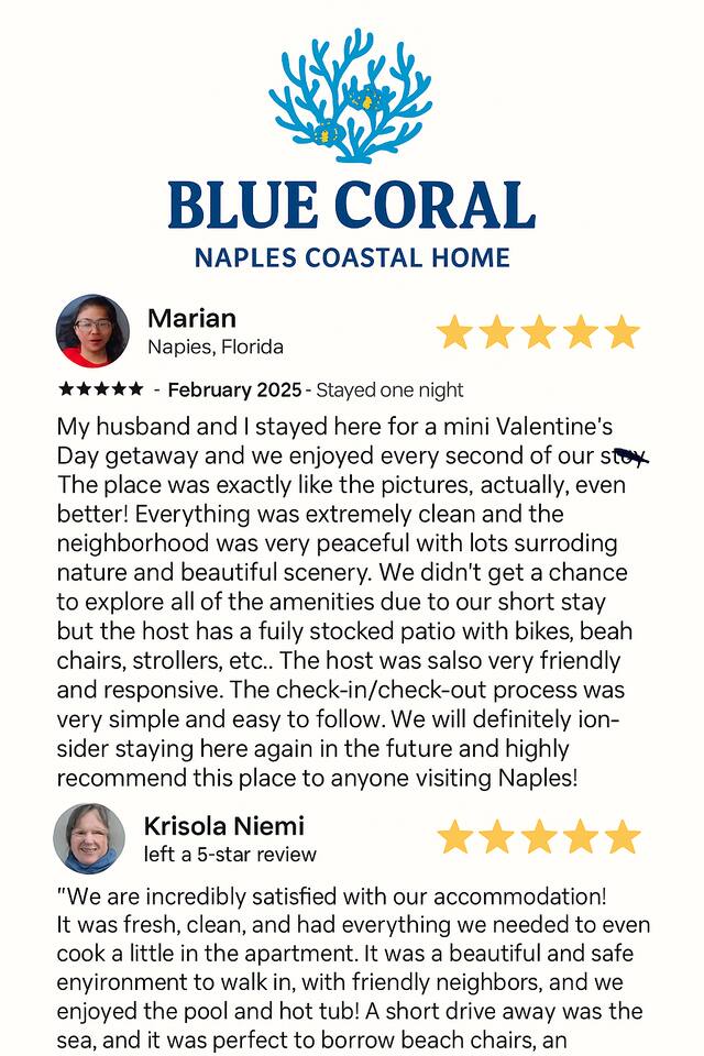 Each room is thoughtfully designed with comfort, storage, and style in mind. 🛋️ LIVING & DINING Spacious open-concept layout featuring a 75” Smart TV and a chic white Natuzzi leather sectional that offers both elegance and comfort. Sink into plush seating with cozy throws at your fingertips—perfect for unwinding after a beach day or enjoying a quiet movie night in style and a second TV in the Seabreeze Suite. 🛏️ SEABREEZE SUITE A peaceful retreat designed for rest and relaxation. Stretch out on a luxurious queen bed with crisp linens, unwind with your favorite shows on the wall-mounted TV, or slip into the private ensuite bath after a day in the sun. Soft lighting, coastal touches, and garden views make this suite your personal oasis. 🛏️ TURTLE COVE bedroom Bright, playful, and family-friendly—this charming room features three twin beds, including a fun cot/trundle setup that’s perfect for kids or extra guests. Thoughtful details, cozy linens, and colorful touches make it feel like a home away from home. Whether it’s a bedtime story, game night, or a peaceful nap, Turtle Cove is where comfort meets fun. Three twin beds (including trundle/cot), perfect for kids or friends Need to check emails or work remotely? A dedicated desk and computer monitor are ready for your use. The fully stocked kitchen is a dream for home chefs: stainless steel appliances, a brand-new reverse osmosis water filter, and two coffee machines—Nespresso and drip—for your morning routine. Enjoy family meals at the dining table or sip cocktails outside on one of two oversized lanais, perfect for sunset lounging. 👶 Traveling with little ones? We've got you covered with a crib, high-chair, pack-and-play, strollers and a collection of toys and board games to keep everyone happy. 🏖️ Beach Day made easy: 4 beach chairs, umbrella, and 7 bikes/scooters are included for your convenience. 🍽️ From October through May, enjoy casual bites and drinks at the Poolside Café, open Monday–Saturday from 11:00 a.m. to 7:00 p.m., with Happy Hour from 4–7 p.m. 🎾 Guests also enjoy access to: 16 tennis & pickleball courts (10 lit for night play!) Heated pool, hot tub, dry sauna & exercise room We take cleanliness seriously—our condo is thoroughly cleaned and sanitized after every stay. Your comfort and satisfaction are our top priority! 🧊 CLIMATE COMFORT Central heat & AC 🚗 Assigned and guest PARKINGs 💡 GOOD TO KNOW 🤫 QUIET HOURS Carl B: "Very quiet and peaceful neighborhood." We love families and peaceful travelers. Party groups, please look elsewhere. County-enforced quiet hours are 9:00 PM to 7:00 AM. Full condo access — no shared spaces Keypad self-check-in for convenience and flexibility Rent Responsibly standards followed Professionally cleaned and sanitized between each stay Essentials provided: linens, towels, soaps, detergents Family-ready: toys, high-chair, pack-and-play included 💼 Business-Friendly Amenities for a Productive Stay: Fast & Reliable Wi-Fi – Perfect for Zoom calls, streaming, or remote work Computer Monitor – Easily connect your laptop for dual-screen productivity Work Desk Area – Comfortable space to stay organized and focused Ergonomic Desk Chair – Ideal for longer working sessions USB Charging Ports & Outlets – Conveniently located for all your devices Printer Access (upon request) – Great for printing boarding passes or documents Quiet Environment – Peaceful surroundings, ideal for focused work or calls Gated Community Access – Added security for professionals on the go Free Onsite Parking – Easy access for corporate travelers with a vehicle Flexible Self Check-In – Arrive anytime with keyless entry for convenience Pool towels provided Beach gear included (chairs, umbrella, cooler) We’re here for your comfort. If anything isn’t right, let us know—we’ll make it right. Your unforgettable Naples escape starts here at Blue Coral Naples Coastal Home. Book now before your dates disappear! 🛎️ Proudly managed by Catch of Naples – where hospitality meets coastal charm.