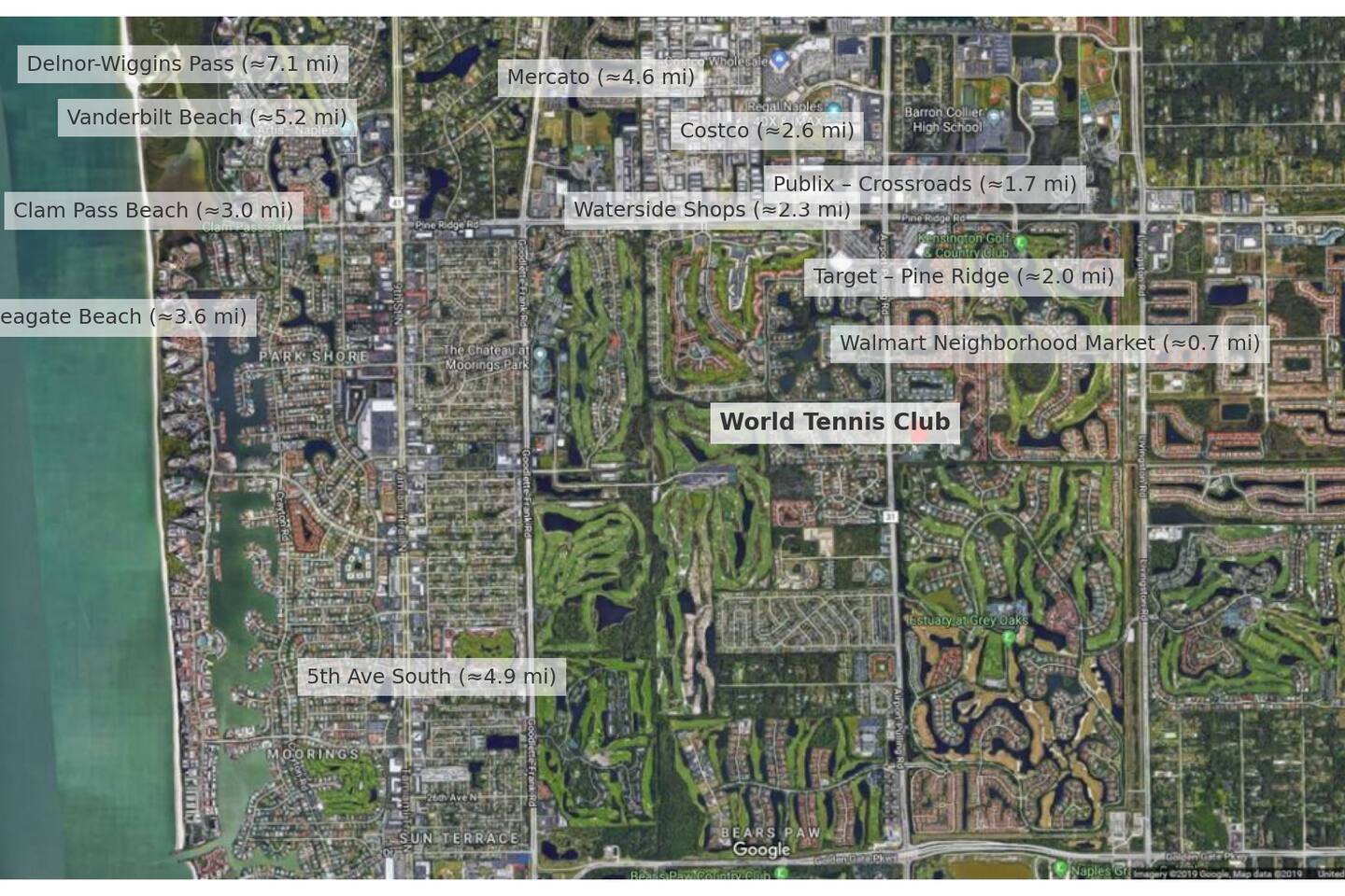 Nearest beach (Clams Pass with the free boardwalk/trolley shuttle): 3.8 miles Nearest Supermarket: Publix at 1.3 miles Walmart Neighborhood Market (groceries): 1 mile Costco: 2.2 miles Public Golf Courses: dozens within 10 miles Movie Theatres: 2 miles Miromar Outlets Mall: 19 miles Marco Island: 30 mins drive